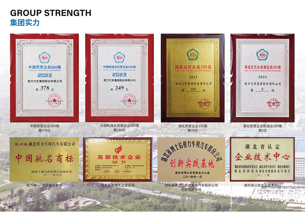 企业知名度和品牌影响力:“程力威”、“大力”商标获得“湖北省著名商标”、“湖北省名牌”、“中国驰名商标”,共有3000多个品种上国家公告目录。产品畅销全国29个省市自治区,并出口50多个国家和地区,其中环卫车和轻型专用车销量连续多年稳居全国榜首。2023年集团位列“中国民企500强”第378位、“湖北民企制造业100强”第5位。