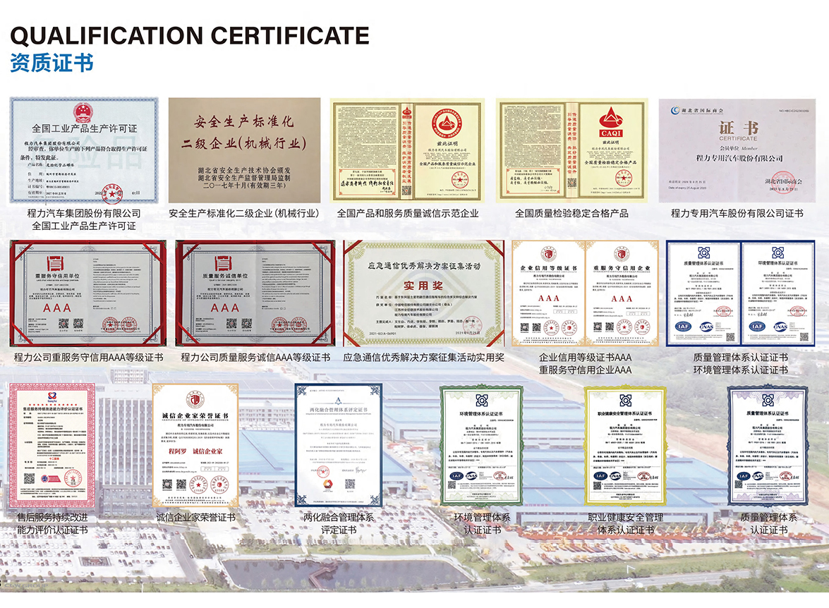 程力专用汽车股份有限公司销售二十三分公司企业资质资源能力:取得ISO9001质量管理、ISO 14001环境管理、ISO 45001职业健康安全管理、售后服务体系、能源管理体系认证证书、国军标、保密及国防建设配套服务资质认证、3C强制性认证、美国机械工程师阿斯米(ASME)认证、欧盟协议ADR认证。拥有专用汽车、随车起重机、汽车吊、车、新能源汽车、汽车整车、客车等稀缺资质资源。